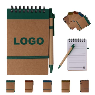 5.5" Kraft Paper Mini Pocket Spiral Notebook W/ Pen