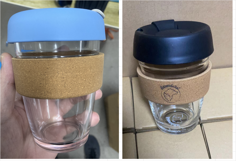 Made of soda-lime glass, this 12OZ coffee cup features a cork sleeve and silicone lid for excellent heat insulation and a comfortable grip. It’s perfect for both hot and cold drinks. With support for laser-engraved black logos (2 logos on opposite sides), it’s ideal for branding. it combines functionality, style, and customization, making it a great choice for cafes, personal use, or promotional gifts.